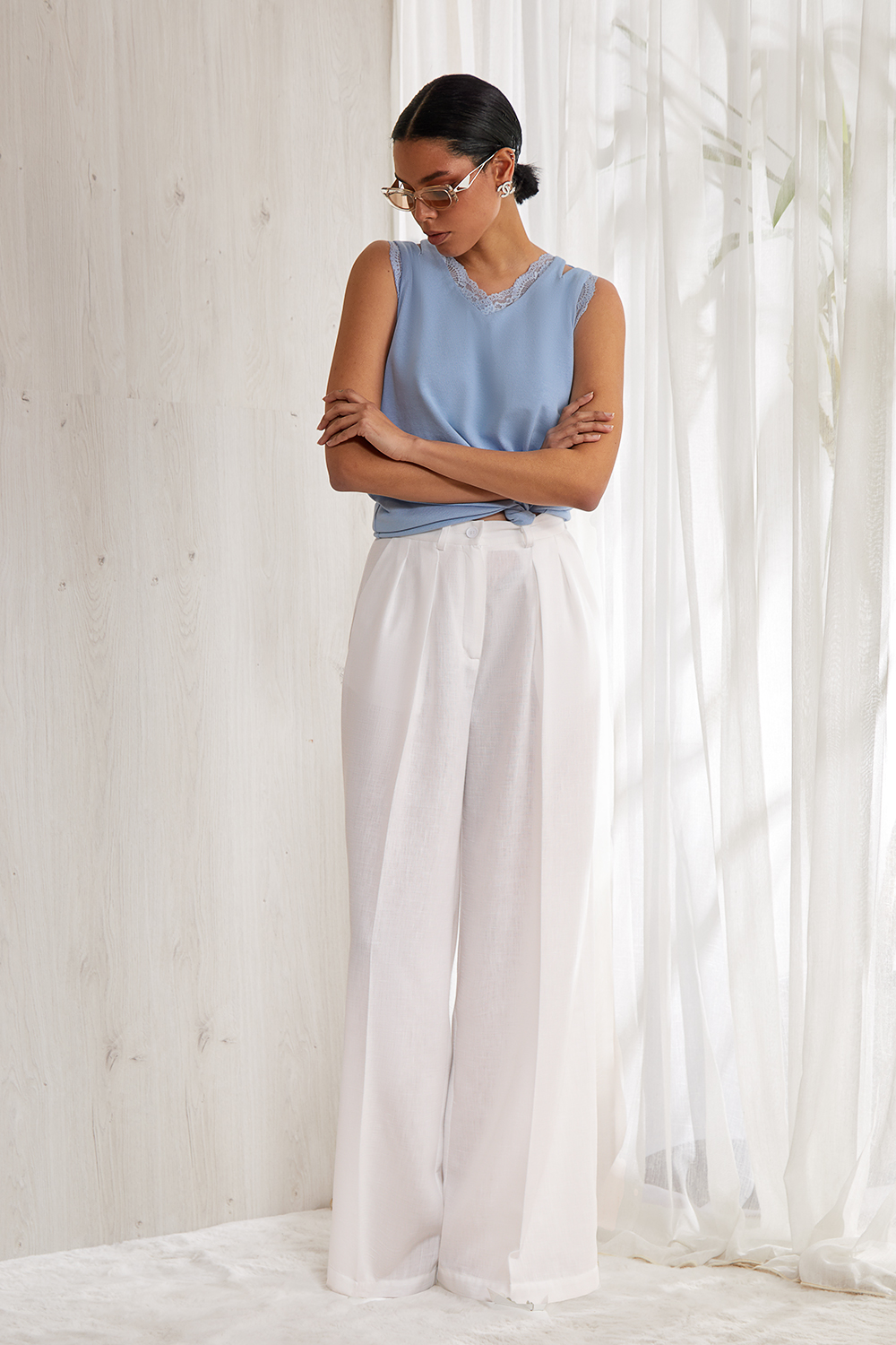 Блуза выполнена из трикотажного полотна. Прямой силуэт. V-образная горловина. Фигурные вырезы по плечевому шву. По горловине и по пройме вставлено кружево. Спинка прямая.