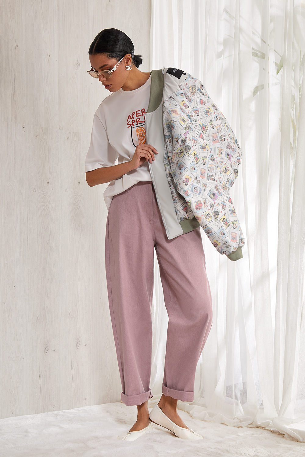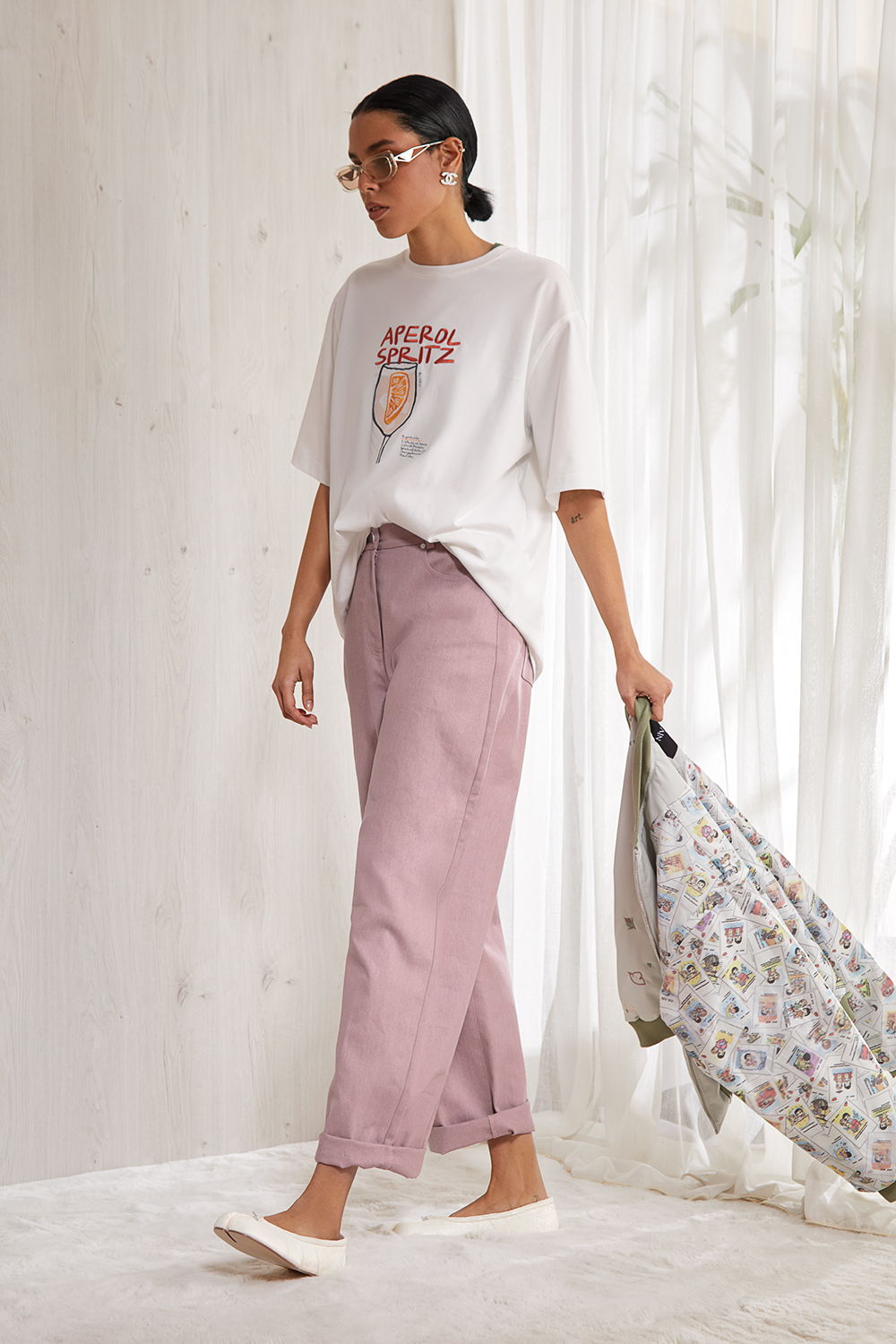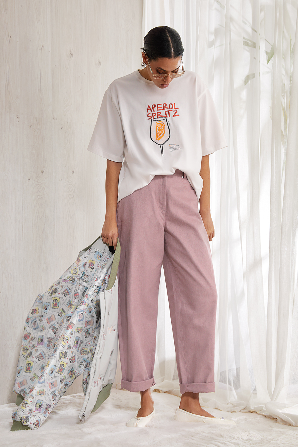 Объемная футболка   оверсайз выполнена из плотного   хлопкового трикотажного полотна (интерлок). Спущенная линия  плеча. Рукав до локтя. Горловина круглая с притачной планкой. Дизайнерский  принт “APEROL” на  передней половинке  футболки.