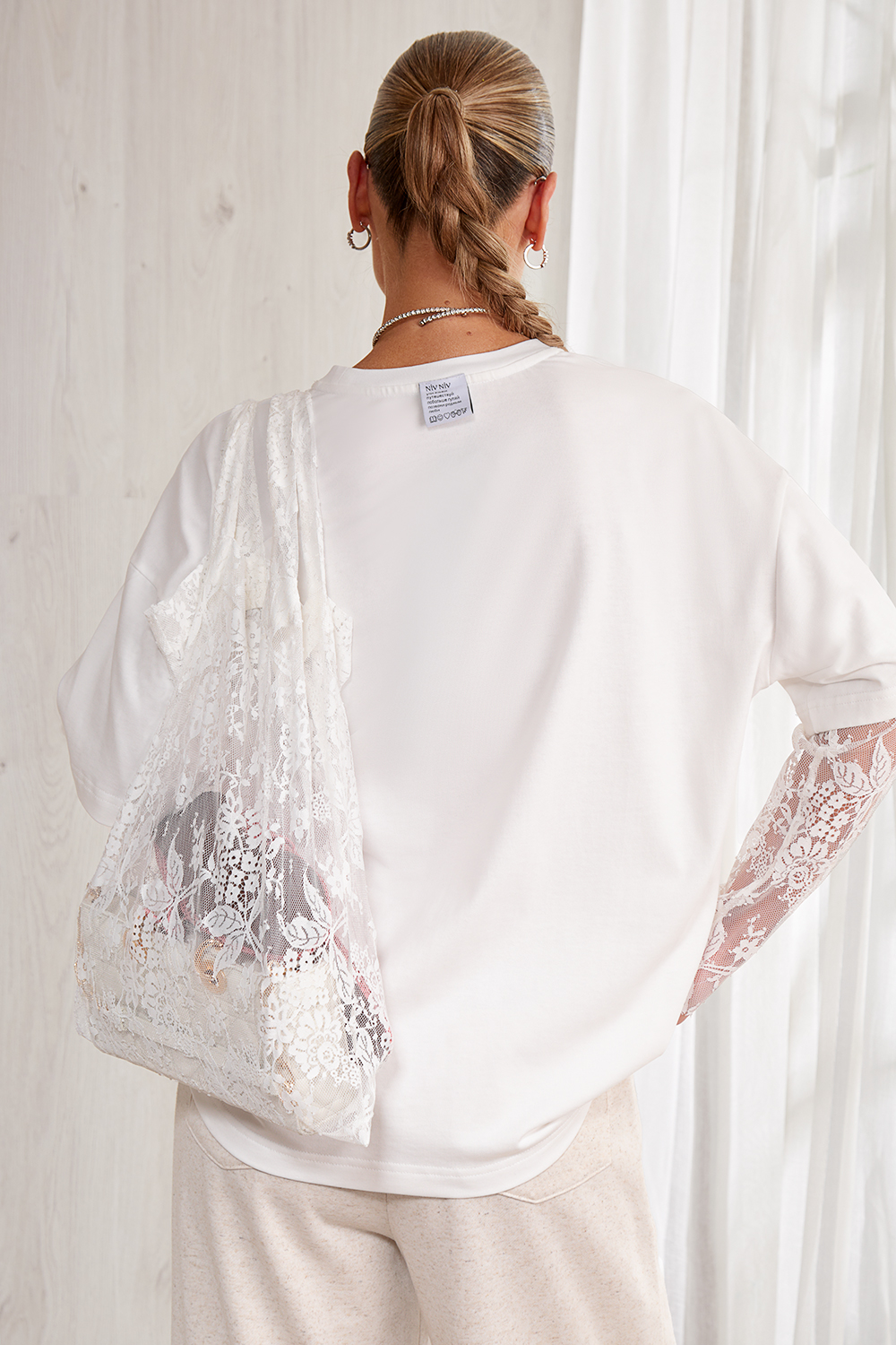 Удлиненная блуза  оверсайз выполнена из трикотажного полотна (интерлок). Изделие великолепно держит форму.  Спущенная линия плеча. Короткий свободный рукав до локтя. Дополнительно в пройму вставлен рукав из тонкого кружева. Горловина круглая с притачной планкой. Спинка прямая. На полочке принт ”бесконечность”.