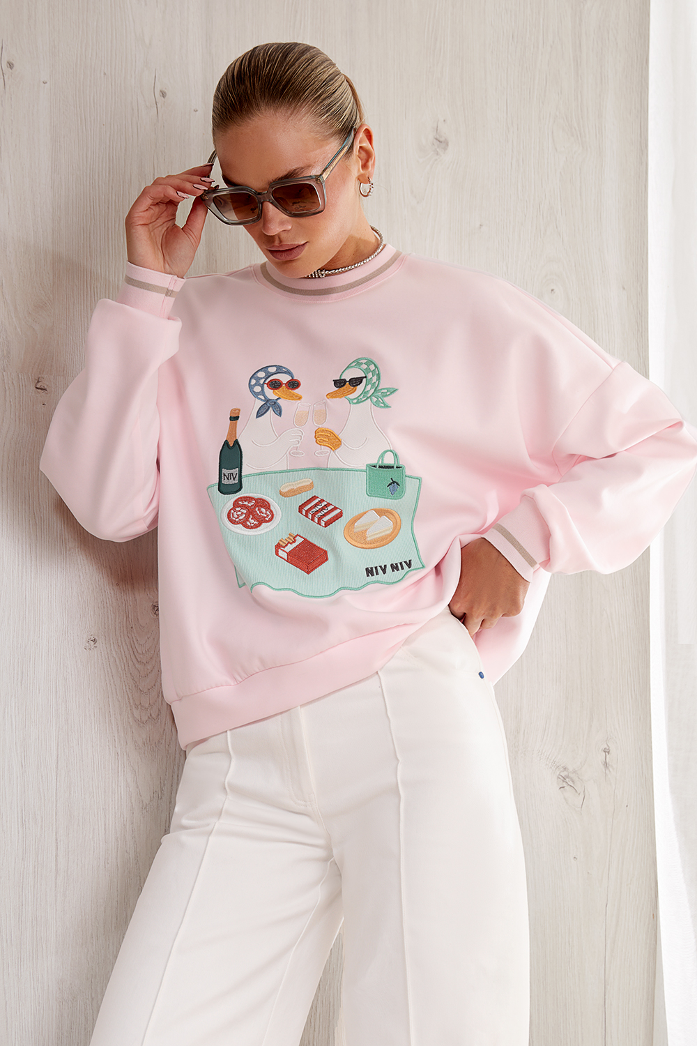 Объемный свитшот из плотного премиального трикотажного полотна(интерлок). Изделие прямое. Горловина круглая с притачной планкой из отделочной ткани. Рукав спущенный, длинный, объемный.  Низ рукава на манжете из отделочной ткани.  Низ  изделия на планке из отделочной ткани. Перед и спинка изделия прямые. На передней половинке свитшота авторская вышивка.