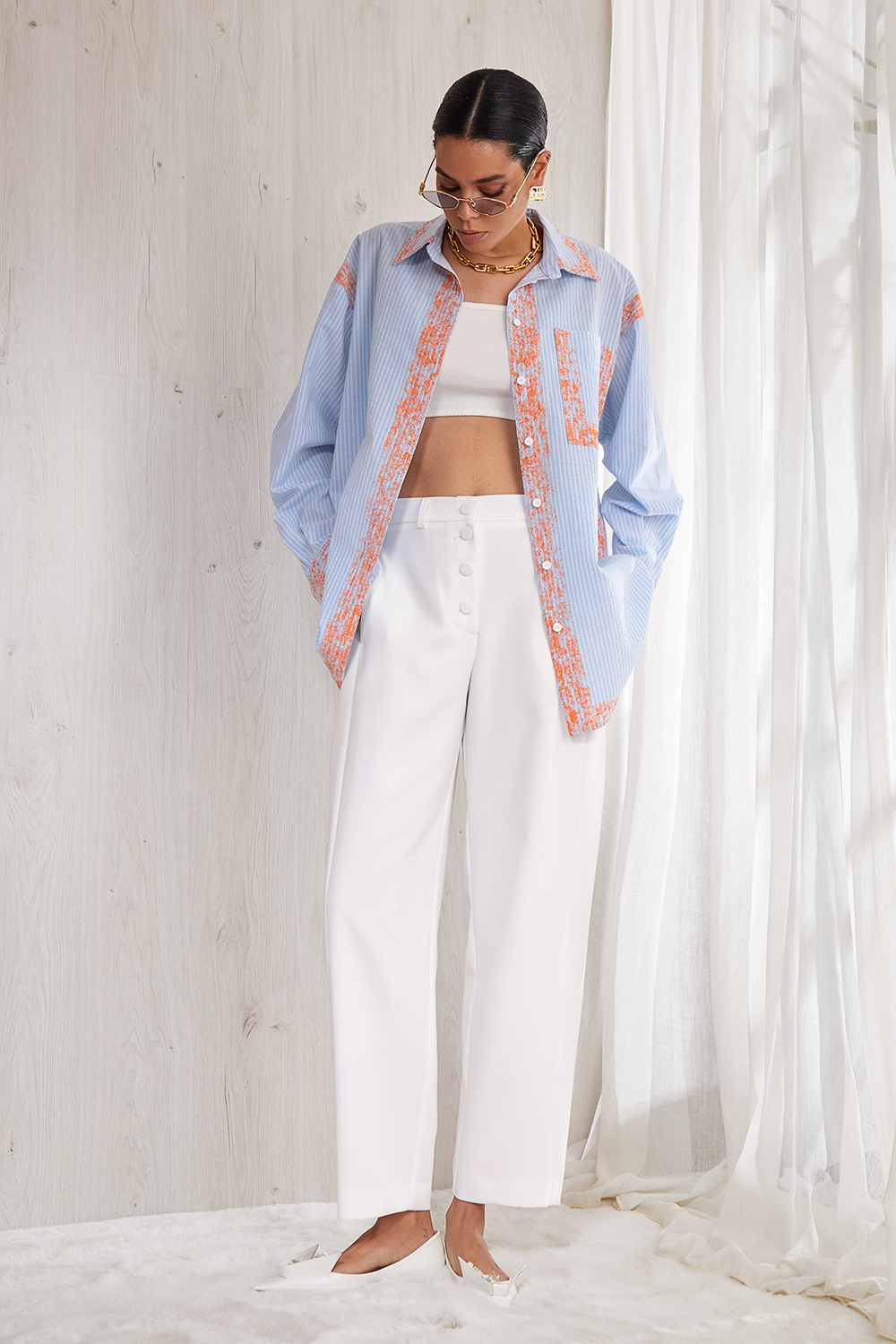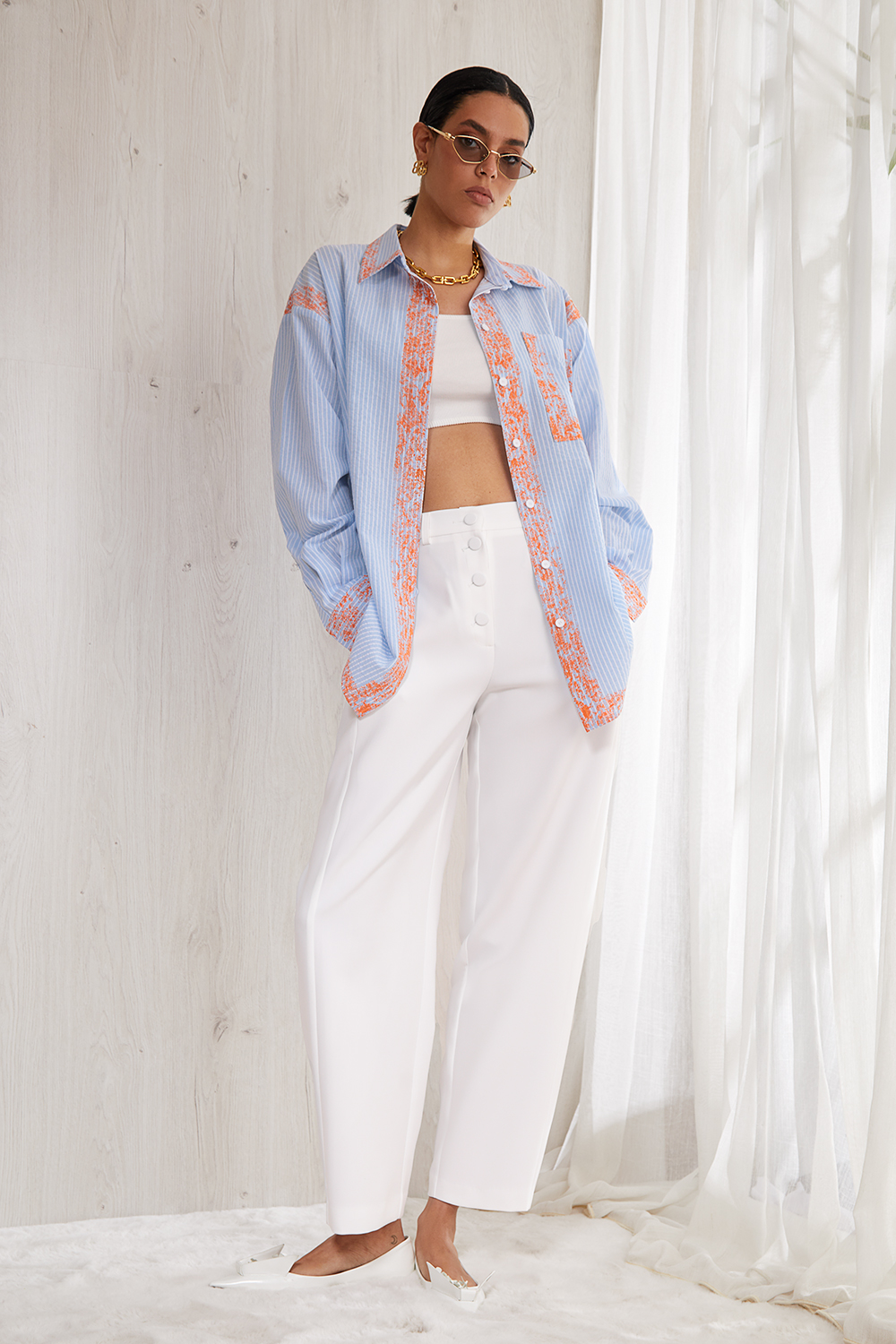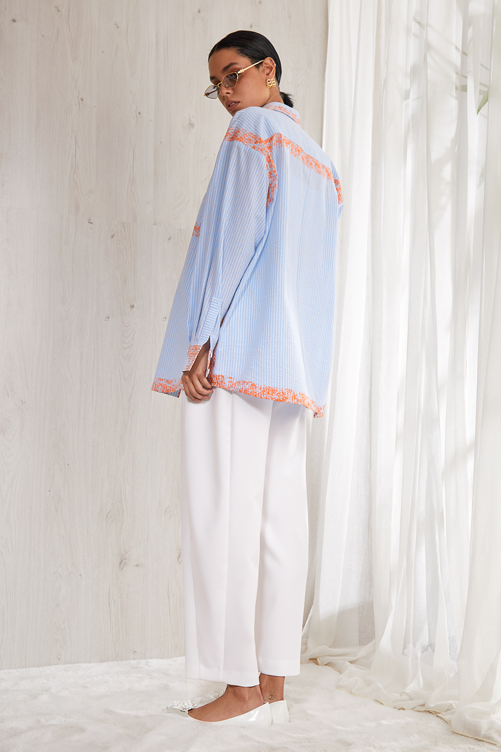 Рубашка  прямого силуэта  длиной   ниже середины  бедра..  Центральная  застежка доверху  на петли и пуговицы. Накладной карман  на  левой полочке изделия. Спущенная линия плеча, объемный рубашечный  рукав. Рукав  на притачной манжете. Спинка с отрезной кокеткой. Рубашечный  воротник на стойке. Авторский принт по всем частям изделия.