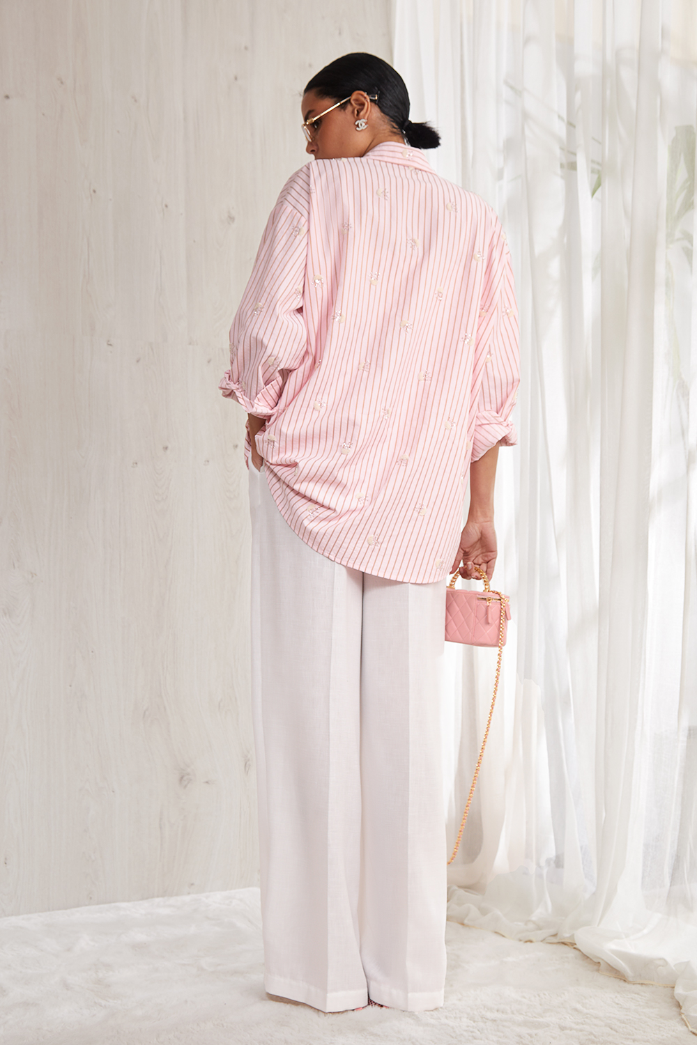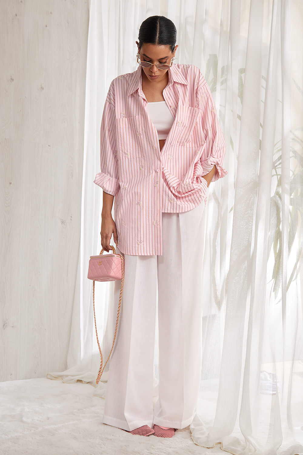 Удлиненная  рубашка  прямого силуэта  длиной   ниже середины  бедра, выполнена   из  премиального хлопка   с вышивкой.  Центральная  застежка доверху  на петли и пуговицы. Накладные  карманы  на  полочках изделия. Спущенная линия плеча, объемный рубашечный  рукав. Рукав  на притачной манжете. Спинка прямая. Рубашечный  воротник на стойке. Ассиметричный низ и высокие закругленные разрезы по боковым швам.