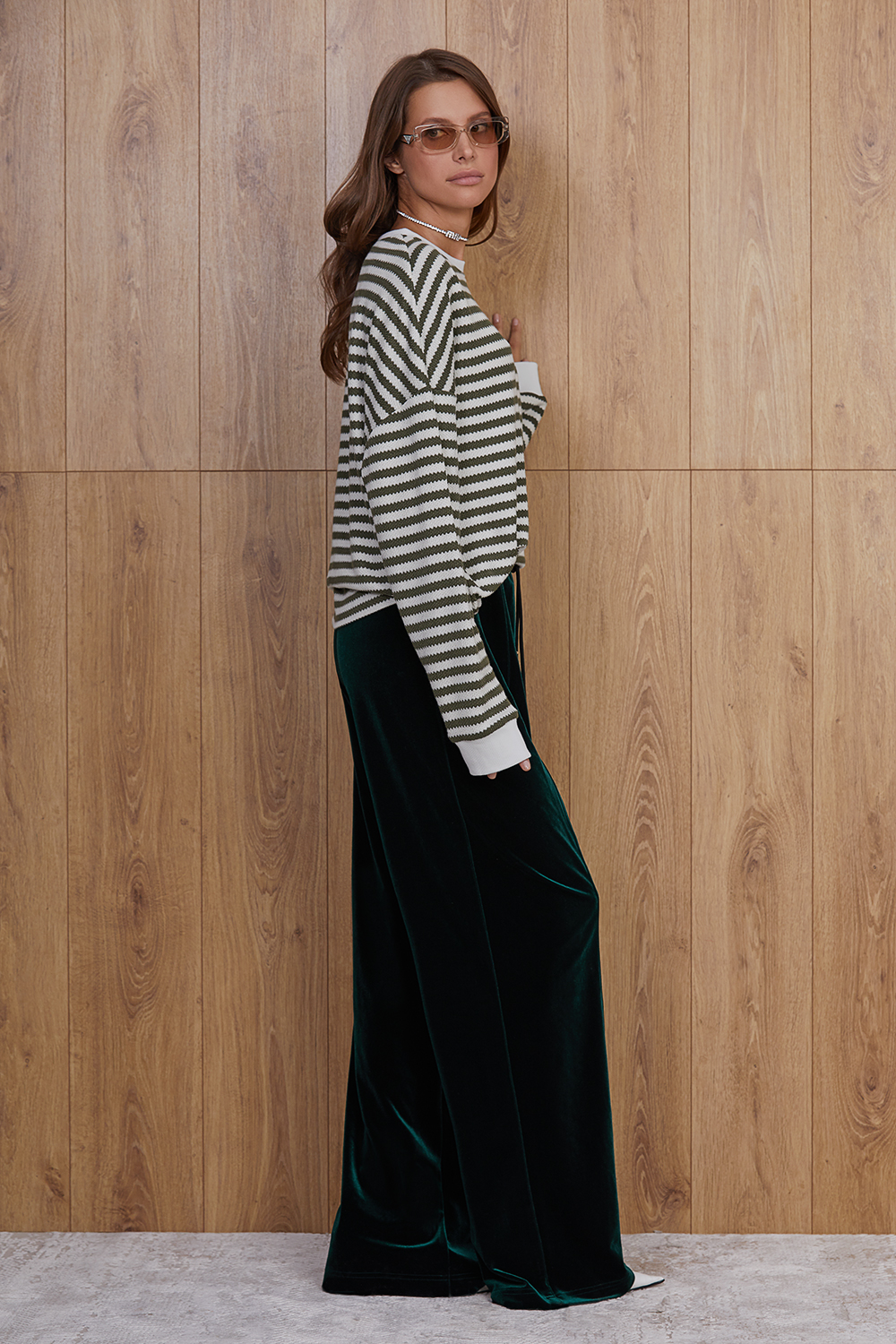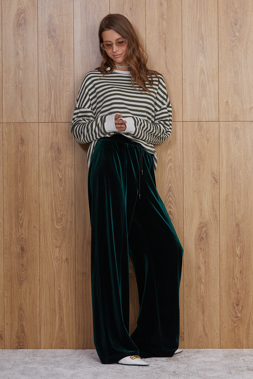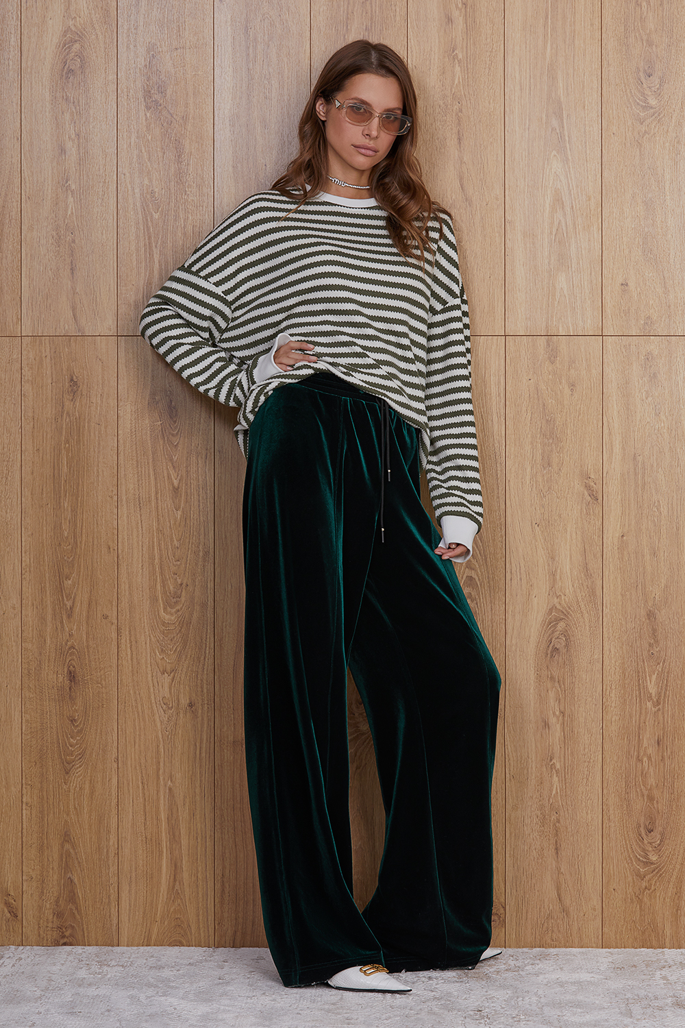 Струящиеся брюки из бархата прямого силуэта. Брюки без застежки.   Карманы в боковых швах. Изделие на поясе, в который вставлена резинка.