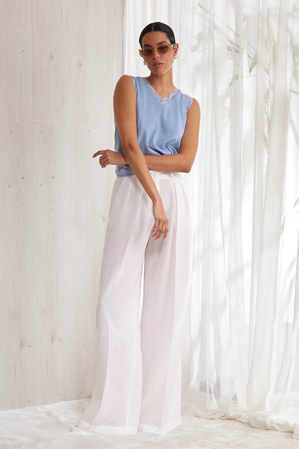 Прямые брюки-палаццо  из тонкого льна с вискозой. Брюки   на  поясе.  Функциональные прорезные   карманы в рамку  в боковых швах. Сзади прорезные карманы в рамку – обманки. По переду  по две  глубокие односторонние  складки.