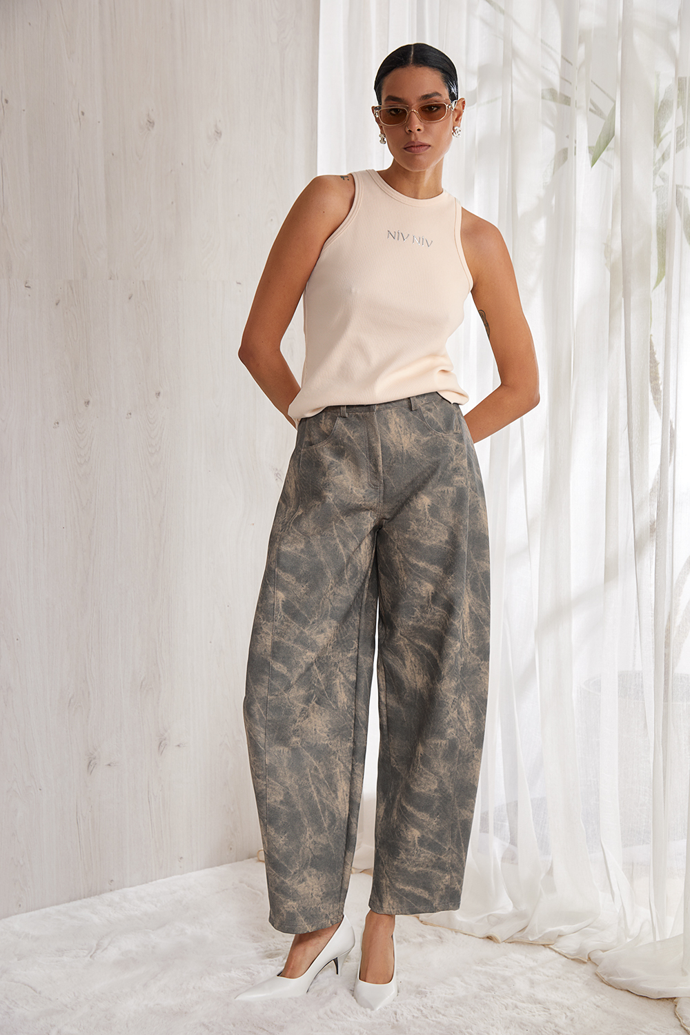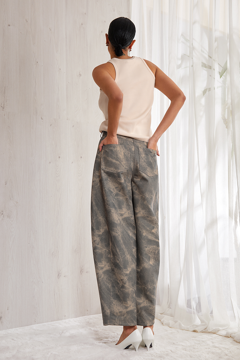 Джинсы О-образные от бедра, укороченные, на   поясе  со шлевками. Высокая посадка. Спереди и сзади вертикальные подрезы, которые конструктивно делают брюки более объемными.  Функциональные карманы  спереди. На задних половинках накладные карманы и классическая фигурная кокетка.