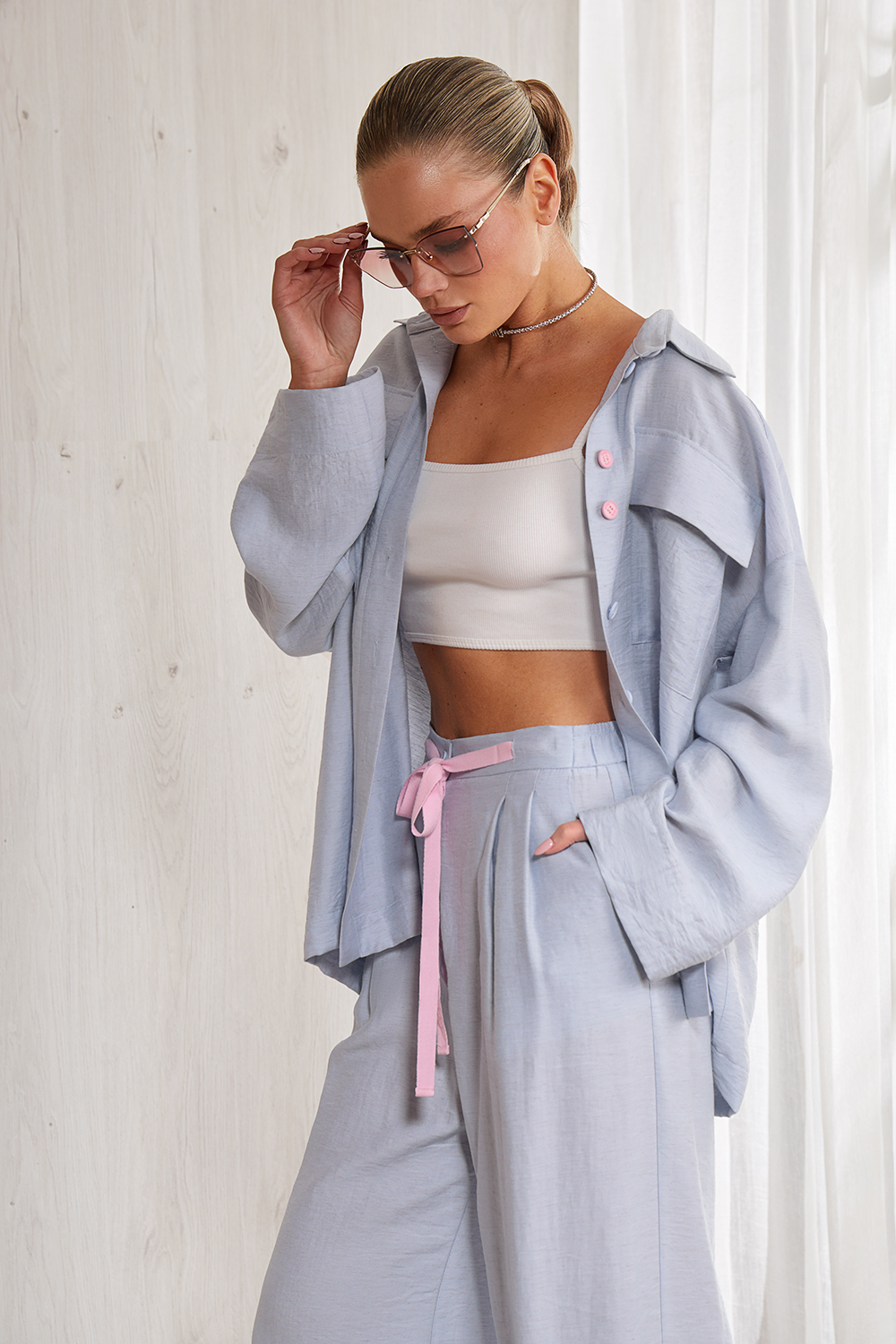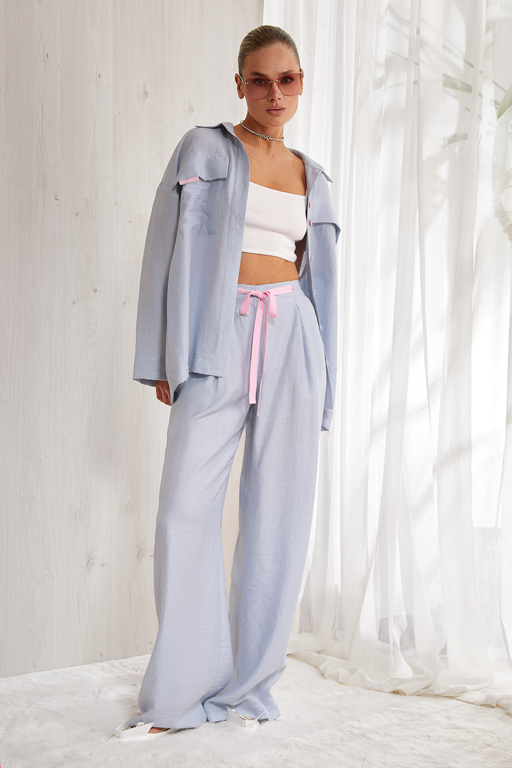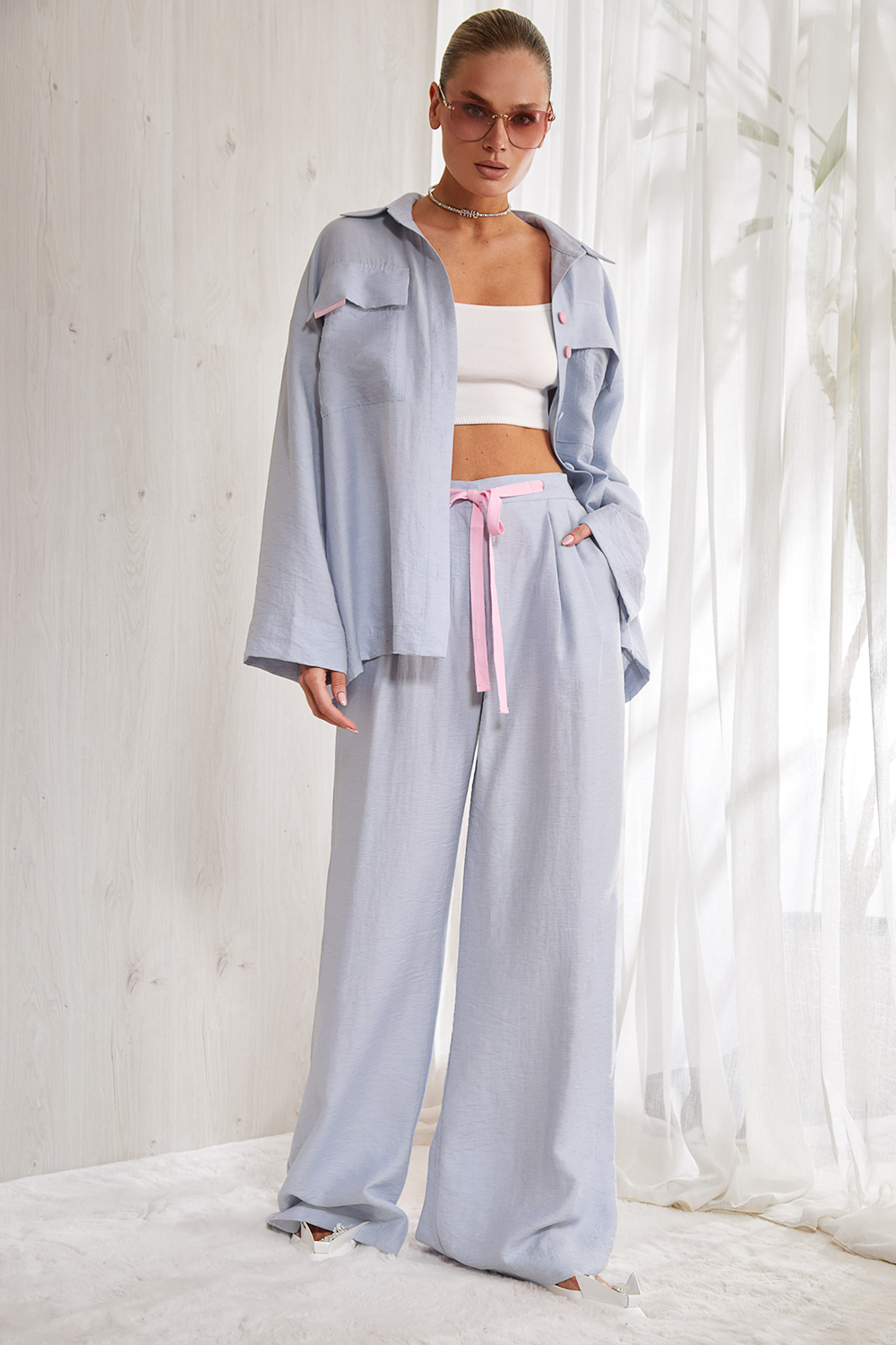 Костюм из тонкого льна, состоящий из рубашки и брюк. Стильная рубашка-блуза прямого кроя длиной до середины бедра. Центральная бортовая   застежка доверху  на петли и пуговицы.  Накладные карманы и клапаны по переду изделия. Отрезная кокетка и  бантовая складка по спинке.  Спущенная линия плеча, свободный длинный  рукав. Рубашечный  воротник на стойке. Широкая подгибка рукава.
