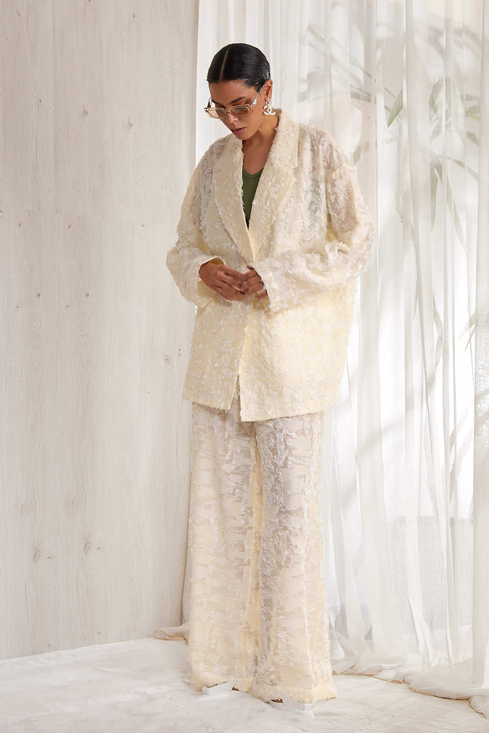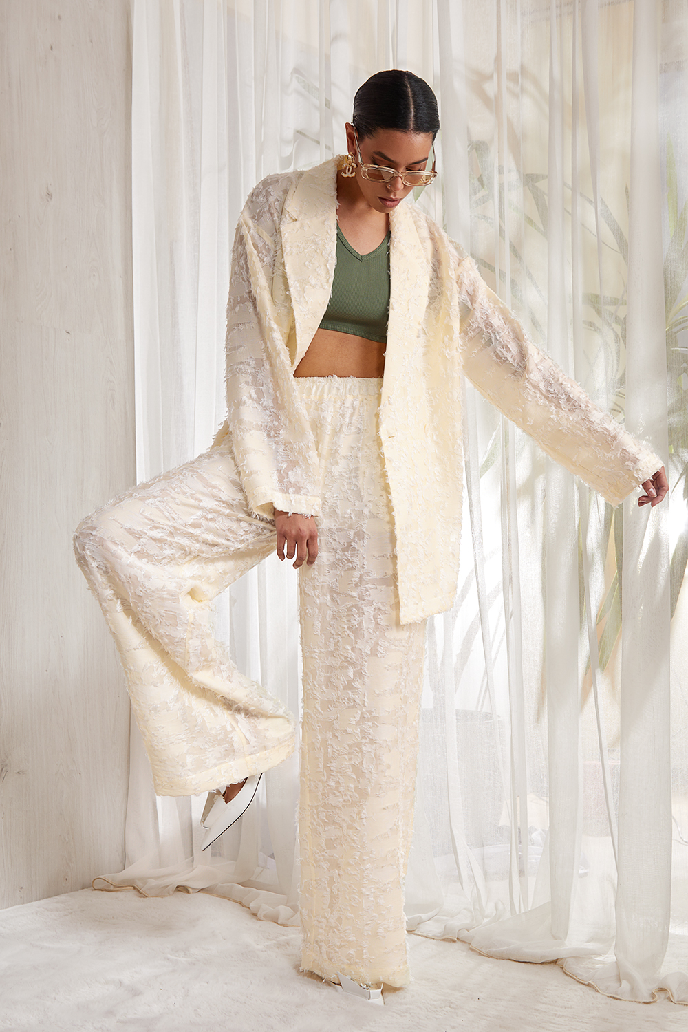 Элегантный  льняной  комплект, состоящий из  брюк и жакета.     Жакет    прямого   силуэта, длиной до  бедер.  Двубортная    застежка  на петли и пуговицы.  Воротник   пиджачного типа. Спущенная линия плеча. Свободный  длинный рукав.  Спинка  прямая. Изделие без подкладки.   Брюки прямые, свободного кроя, без подкладки. Брюки на резинке (без застежки). Карманы в боковых швах.