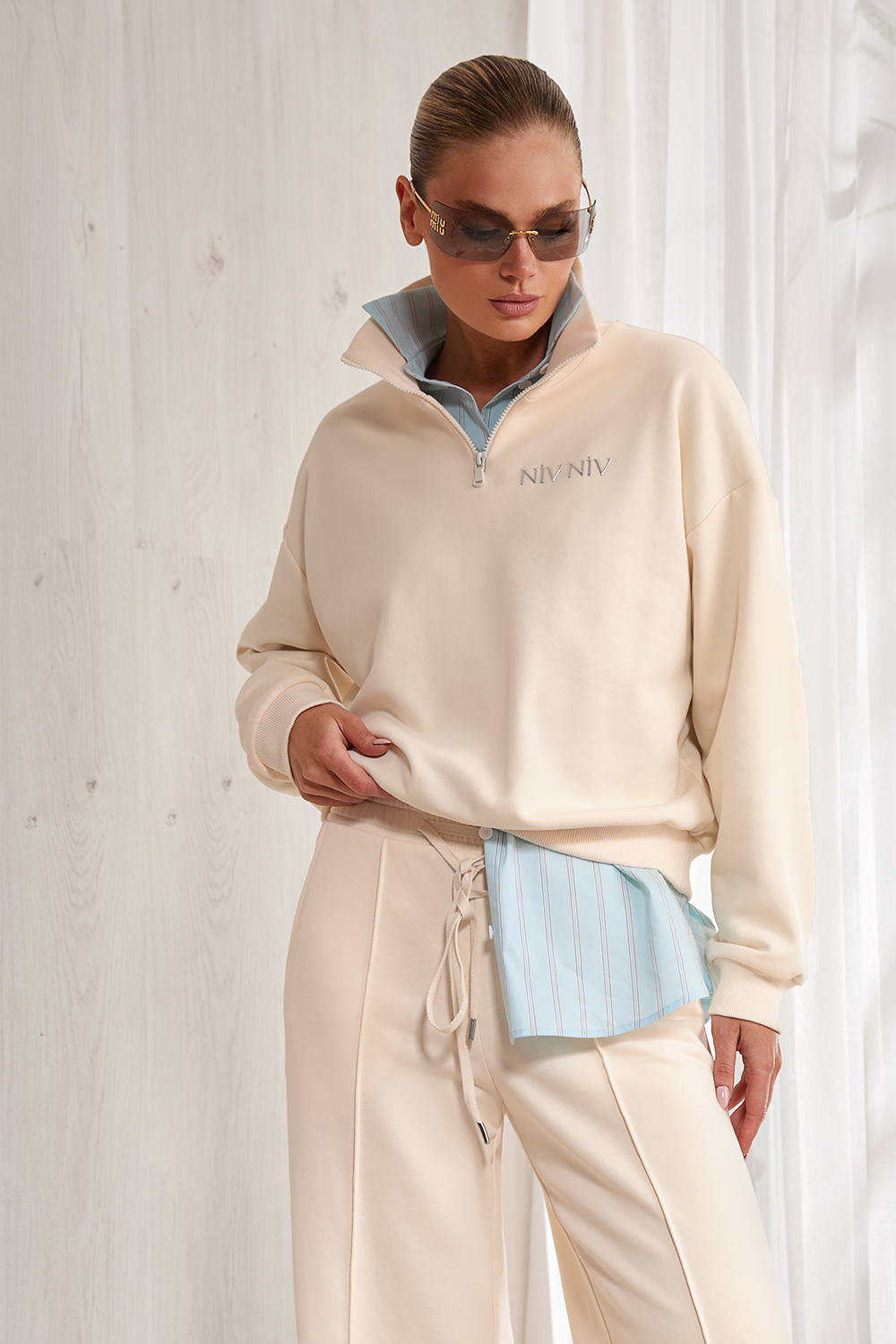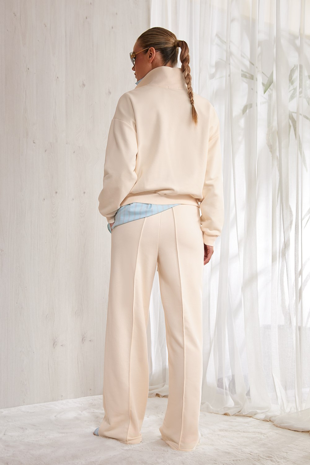 Костюм, выполнен из премиального трикотажного полотна, состоящий  из свитшота и брюк. Свитшот  прямого силуэта, перед и спинка изделия прямые, спущенная линия  плеча. Горловина - высокая стойка  на молнии. Низ рукава и низ изделия на притачной манжете. Лого на полочке изделия. Брюки свободного кроя на резинке. Карманы в  боковых швах.   Передние и задниеполовинки брюк  с застроченными кантами. По поясу вставлен декоративный шнурок.