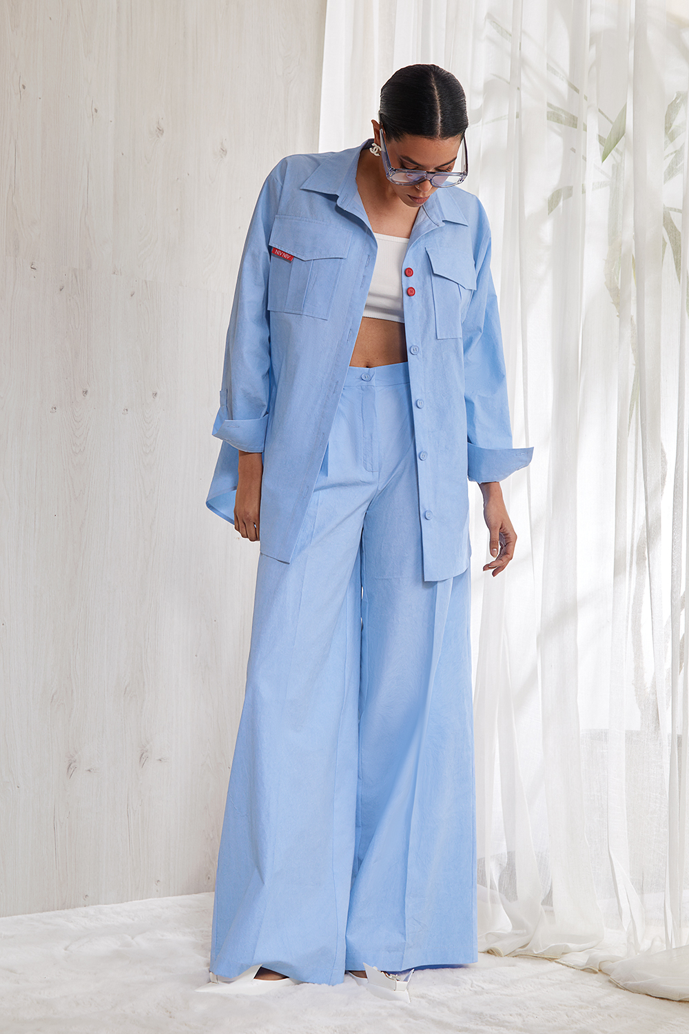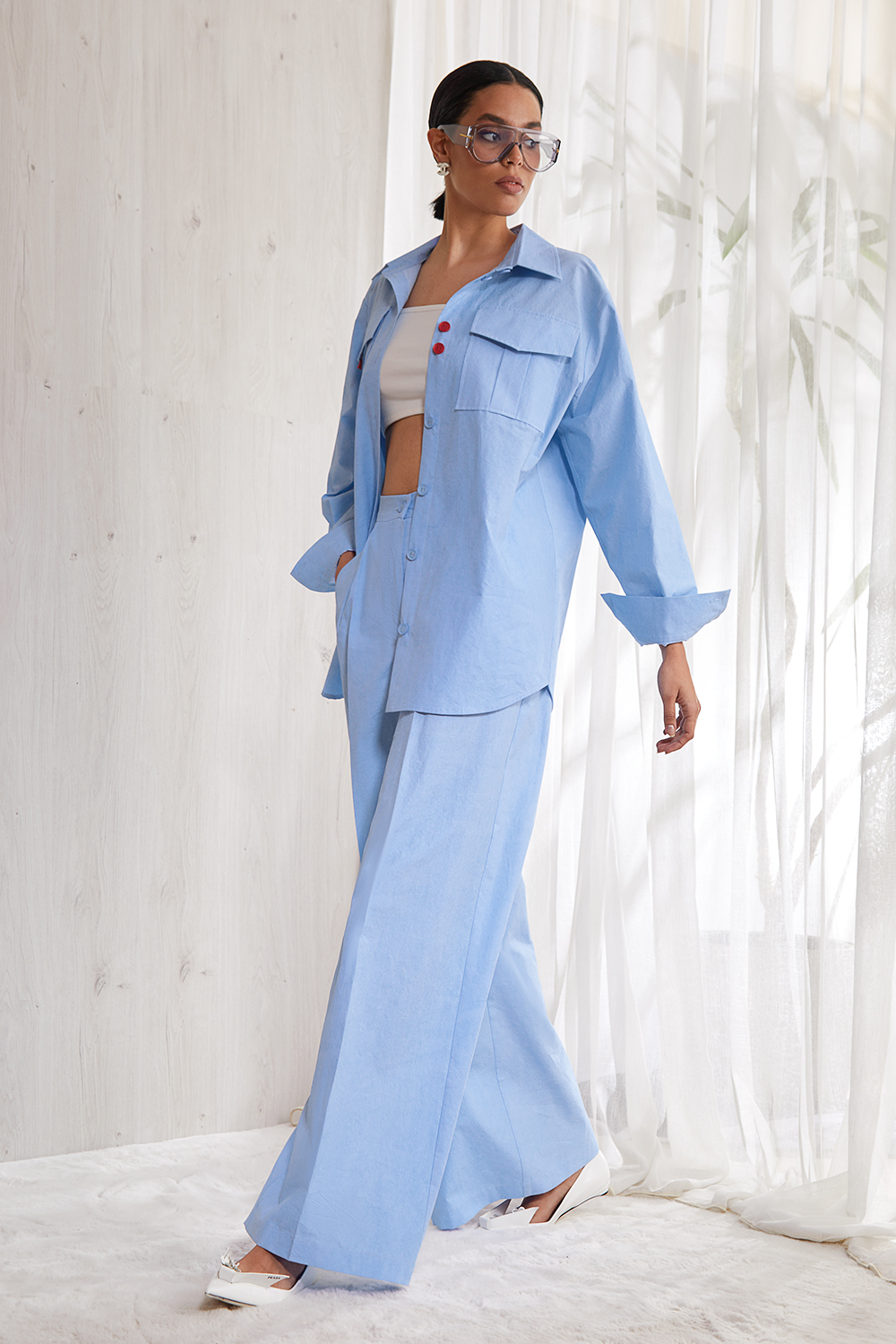 Костюм, состоящий из стильной удлиненной рубашки и  брюк.
