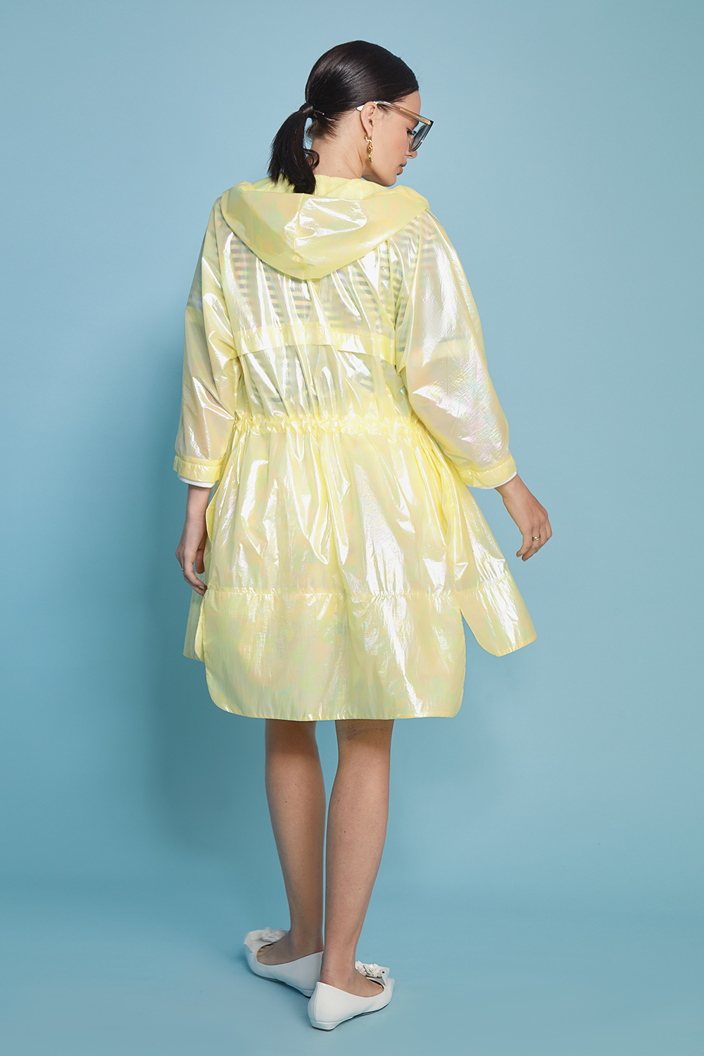 Пыльник выполнен из тонкой плащевой ткани с эффектом бензина. Изделие прямого силуэта,длина выше колена. Центральная бортовая застежка на петли и пуговицы. По переду отрезная планка, горизонтальная кокетка и прорезные карманы. Спинка прямая с отрезной горизонтальной кокеткой. Спущенная линия плеча. Прямой рукав, длиной 7/8. Низ рукава с притачной манжетой из отделочной ткани. По талии выполнена кулиса ,в которую вставлен декоративный шнурок. Горловина оформлена капюшоном. Низ изделия ассиметричный.