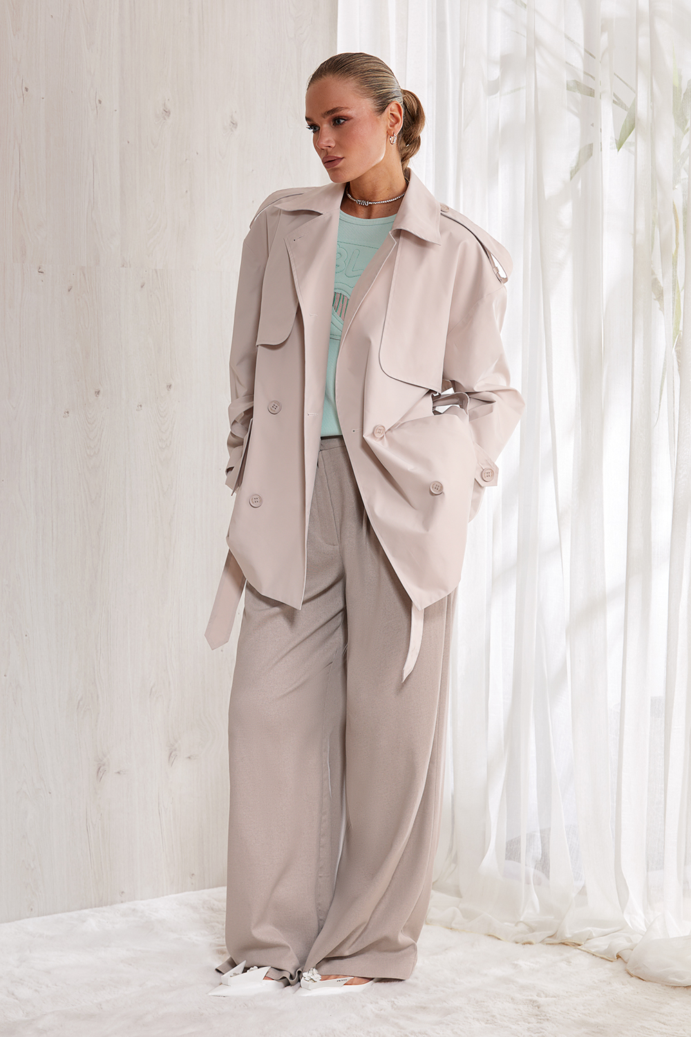 Плащ прямого силуэта длиной до середины бедра с двубортной застежкой в два ряда пуговиц.  На передних половинах отлетные кокетки и прорезные карманы с клапанами. Спинка прямая без среднего шва, с фигурной отлетной кокеткой. Плечо спущено. На плечах декоративные паты. Рукав прямой, длинный, низ рукава также с декоративной патой.  Воротник стояче-отложной.