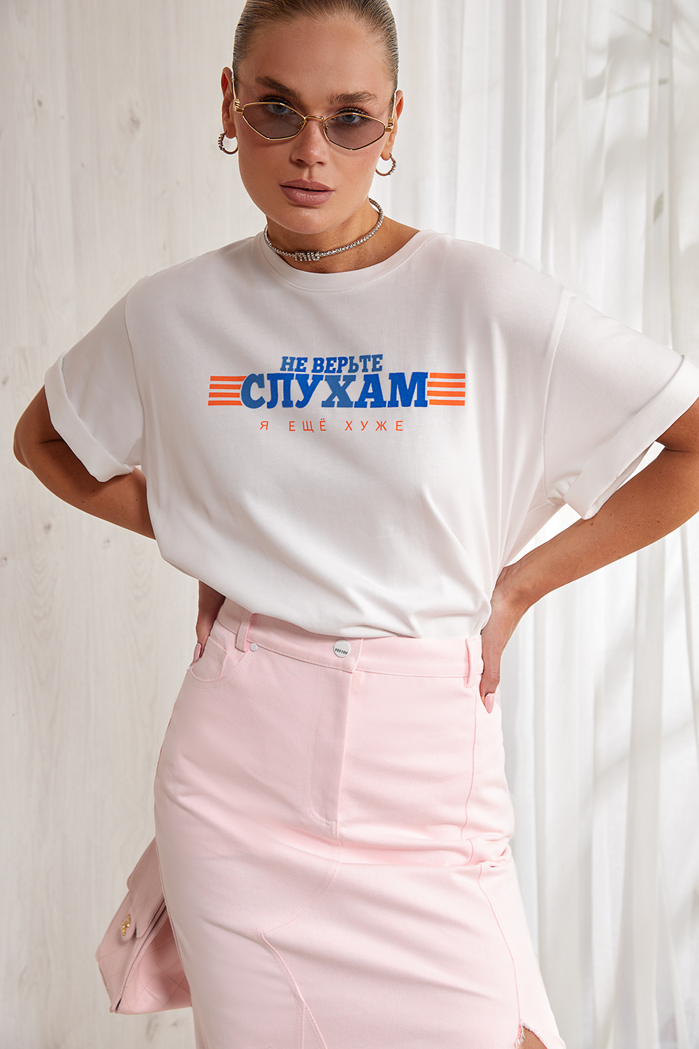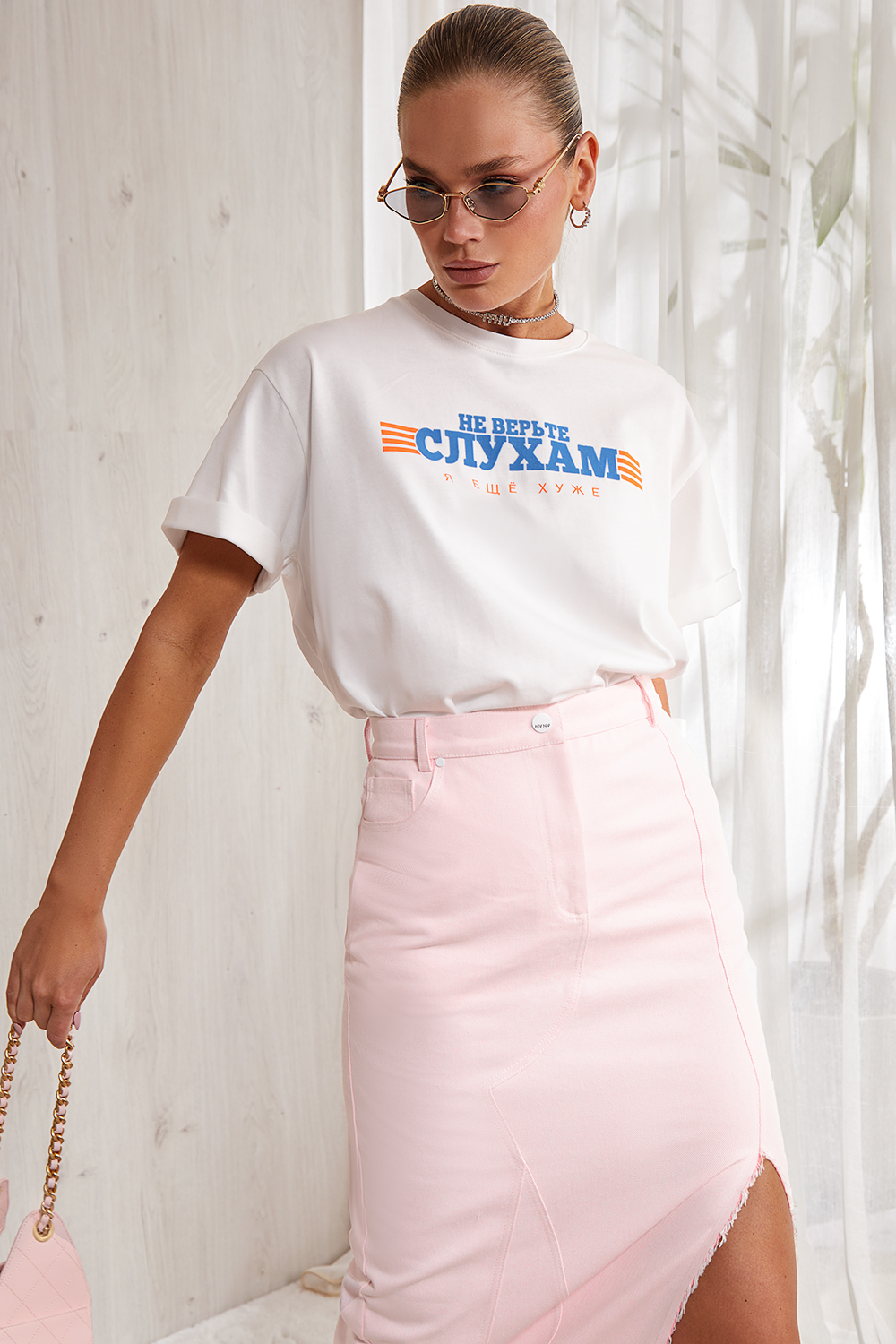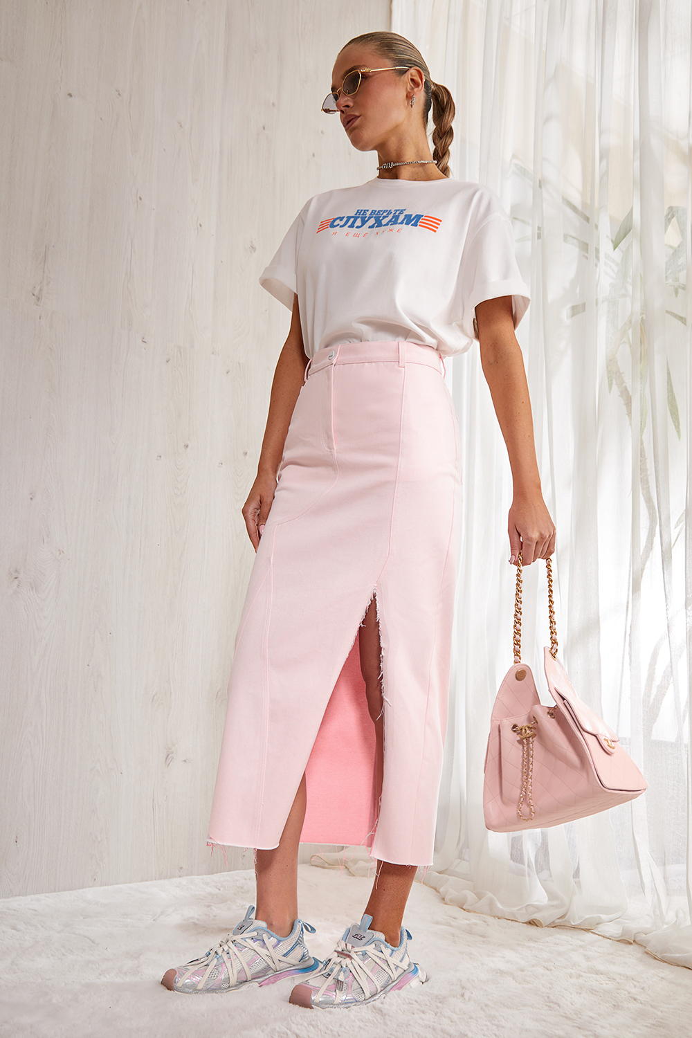 Джинсовая юбка  длина midi. Юбка   на поясе  со шлевками, немного зауженная книзу. Застежка  спереди.  Карманы и фигурные вертикальные подрезы на передних половинках, в одном из которых выполнен разрез с необработанным краем.  Сзади в юбке средний шов, фигурная кокетка  и накладные карманы. Низ изделия необработан.